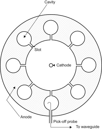 마그네트론( 그림 2.6)은 본질적으로 양극이 매우 정확한 치수의 구멍(구멍과 슬롯 형태로)이 절단된 구리 실린더인 다이오드 진공관입니다. 음극은 실린더의 중심축을 따라 위치한 기둥입니다. 영구 자석은 실린더의 축을 따라 작용하는 매우 강력한 자기장을 적용합니다. 자기장이 없는 상태에서 펄스가 음극에 적용될 때 전자가 규칙적인 방식으로 음극에서 양극으로 방사상으로 흐를 것으로 예상할 수 있습니다. 영구 자석에 의해 생성된 자기장은 펄스에 의해 생성된 전기장과 직각이기 때문에 전자는 양극으로 직접 이동하는 경로에서 편향됩니다(모터 원리 적용). 많은 전자는 경로가 양극으로 향하거나 양극에서 멀어지는 방향이 번갈아가며 속도가 증가 및 감소하는 복잡한 진동 여행 후에만 결국 양극에 도달합니다. 각 전자의 움직임은 그 부근에서 움직이는 수백만 개의 다른 전자의 전자기적 영향에 의해 더욱 영향을 받을 것입니다. 효과는 매우 복잡하지만 다음과 같이 요약할 수 있습니다.전자 속도 가 규칙적이고 반복적이라면 그러한 변화와 연관되어 교감 변동하는 전자기장이 있을 것입니다. 일정한 전기장(변조기 펄스에 의해 제공됨)과 일정한 자기장(영구 자석에 의해 제공됨)에는 특정 한계가 있으며 외부에서는 진동이 발생하지 않습니다. 그러나 적절한 한계 내에 있는 값을 선택하면 발생하는 진동의 주파수는 공동의 물리적 치수에 의해 결정됩니다. 마그네트론 내에서 생성된 RF 에너지는 레이더 펄스를안테나로 전달되는 도파관 .